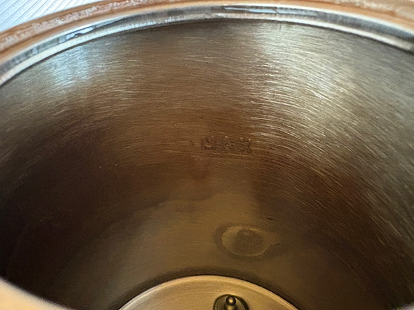 見た目もかなりお気に入りです。私が選んだのはカッパー色で、フタの取っ手と持ち手が木目調になっています。キッチンに置くだけで、おうちカフェの気分も上がります。においがつきにくいステンレス製の内側には、最大容量(800ml)の線があって、分かりやすいです。